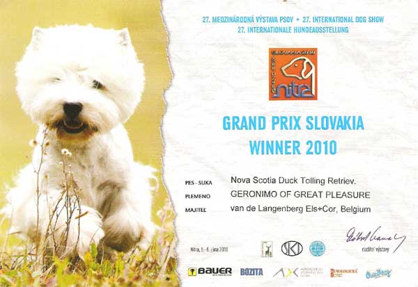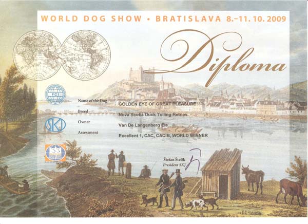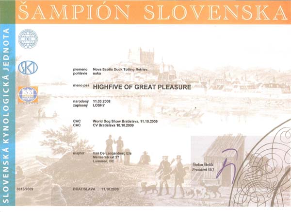 Highfive of Great Pleasure (Una) behaalde het CAC op de World Retriever Club Show en op de World Dog Show in Bratislava en ze werd hiermee ook Slovaaks Kampioen. Haar tweede kampioenstitel op de leeftijd van 19 maanden !!!
