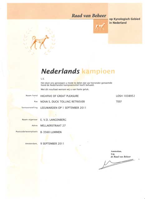 De dag voor het Europees Kampioenschap werd Highfive Of Great Pleasure (Una) beste teef en daardoor Nederlands Kampioen !