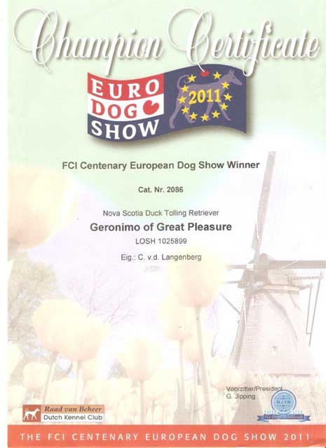 | 25/09/2005 | Op de Kampioenschapsclubmatch van de Nova Scotia Duck Tolling Retriever Club in Nederland werd Chenne of Great Pleasure beste teef |